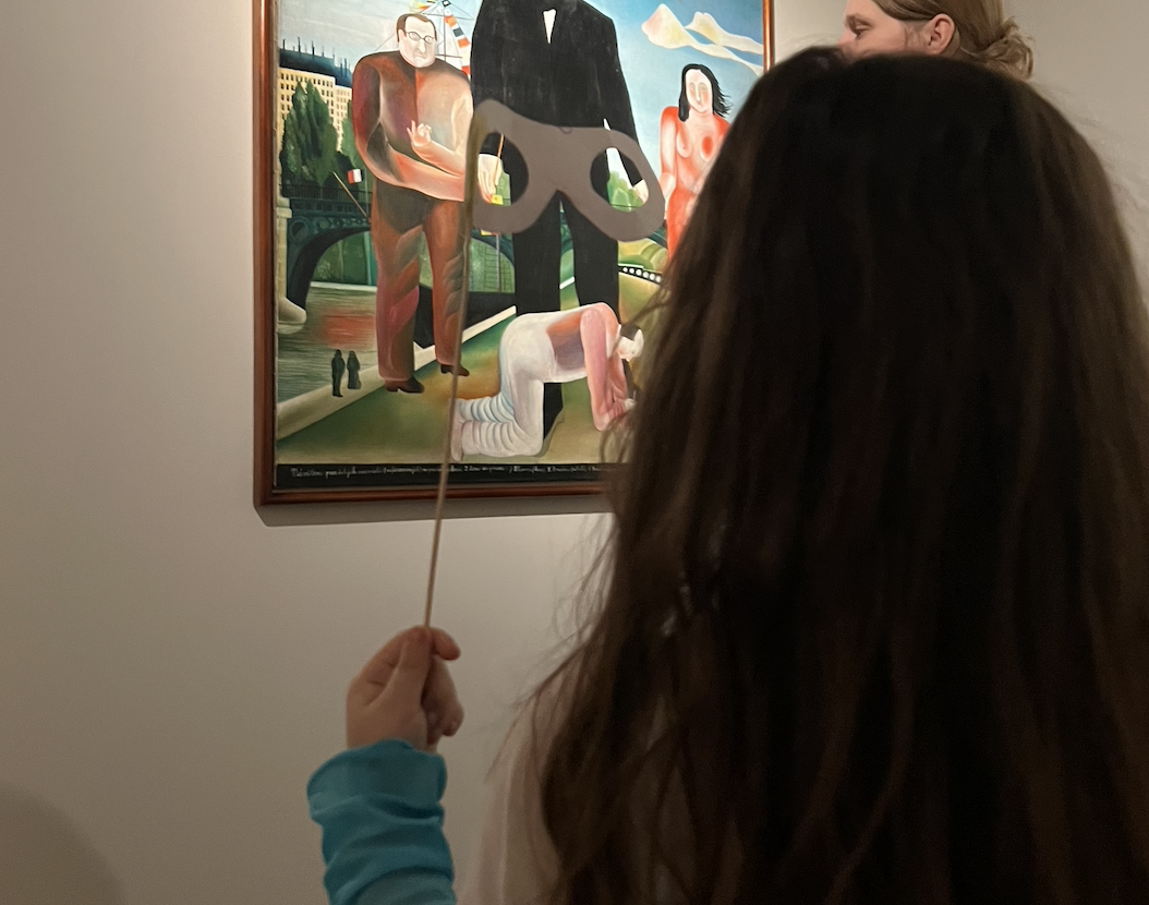Next came mask-making. The children colored their designs, attached them to sticks, and we stepped into the exhibition. We were surrounded by the rich and varied work of Eva Švankmajerová, spanning painting, video, and sculpture. I was reminded of watching Jan Švankmajer’s films decades ago on a bunny-eared television in Kansas, so it felt especially meaningful to encounter those films again here, now in conversation with Švankmajerová’s work at the center. At first the children entered cautiously, then gradually grew more confident, lifting their masks to look closely at the pieces introduced to them.